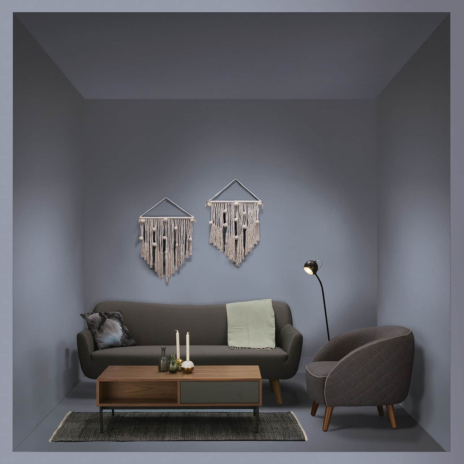 Brat lounge chair with Cocoa colour leg, Battle Ship Grey colour body and Pale Silver colour piping in Dimity fabric