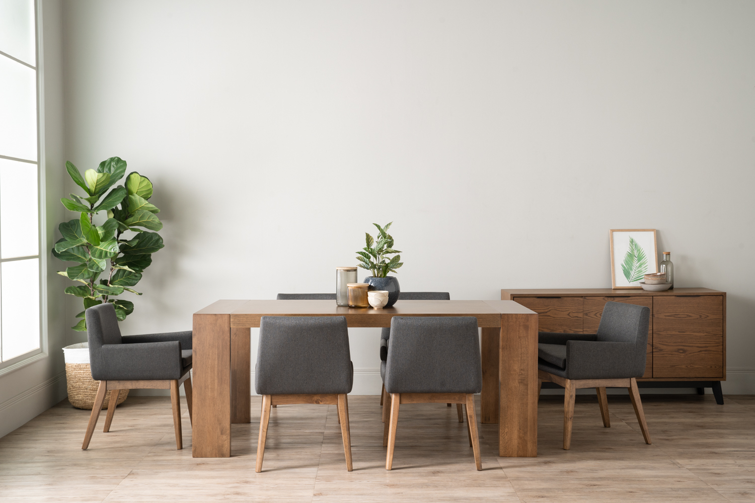 Chanel dining chair in Cocoa colour leg, Battleship Grey colour Drill fabric frame