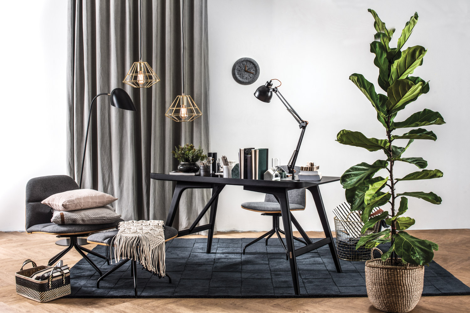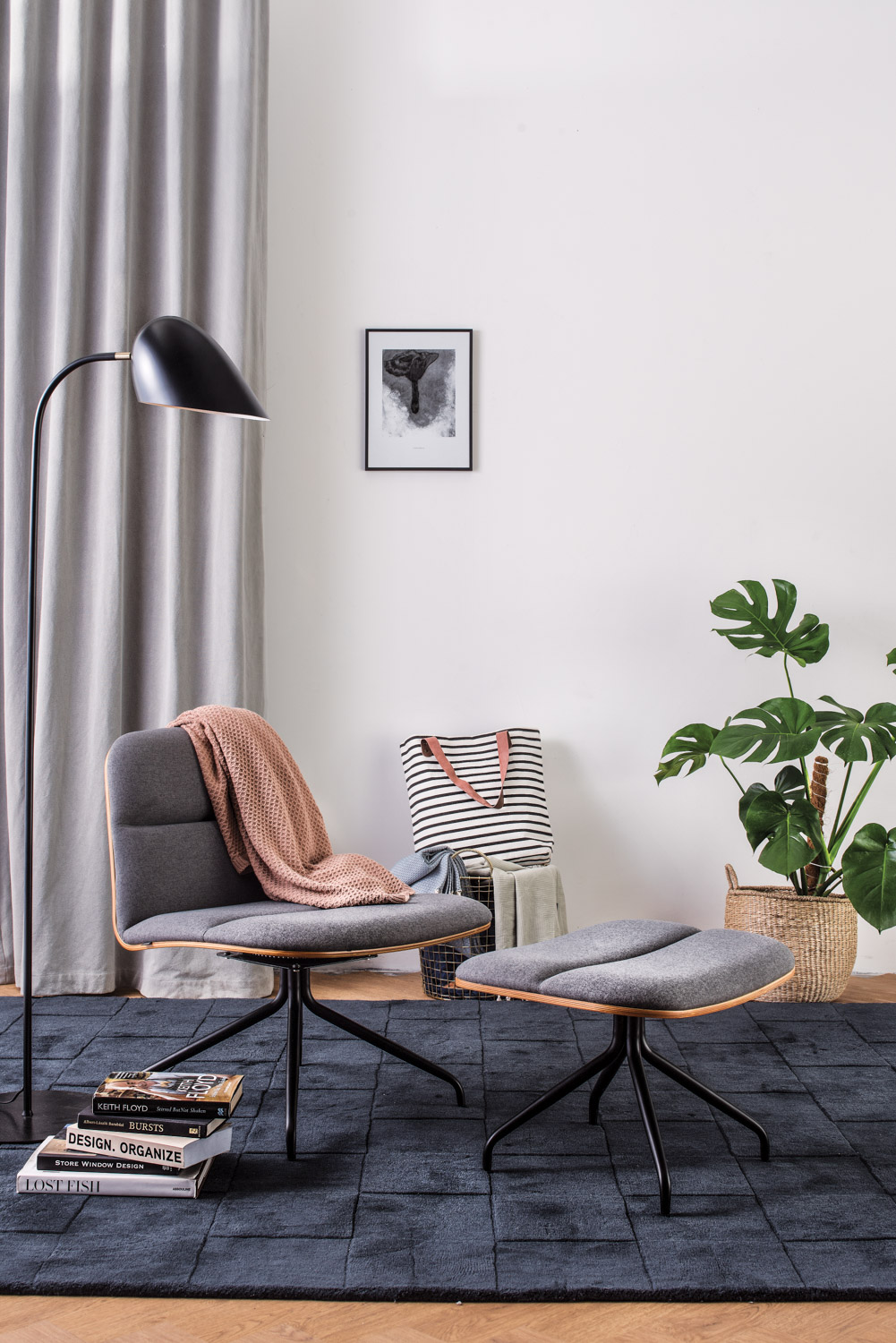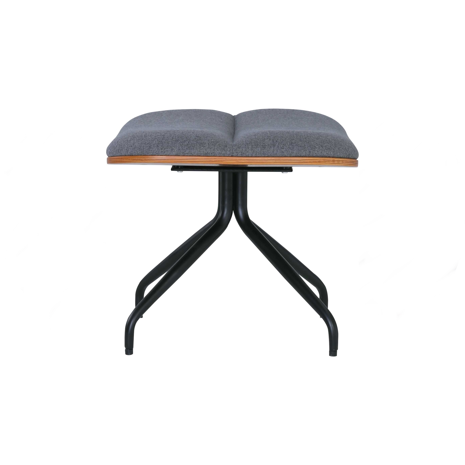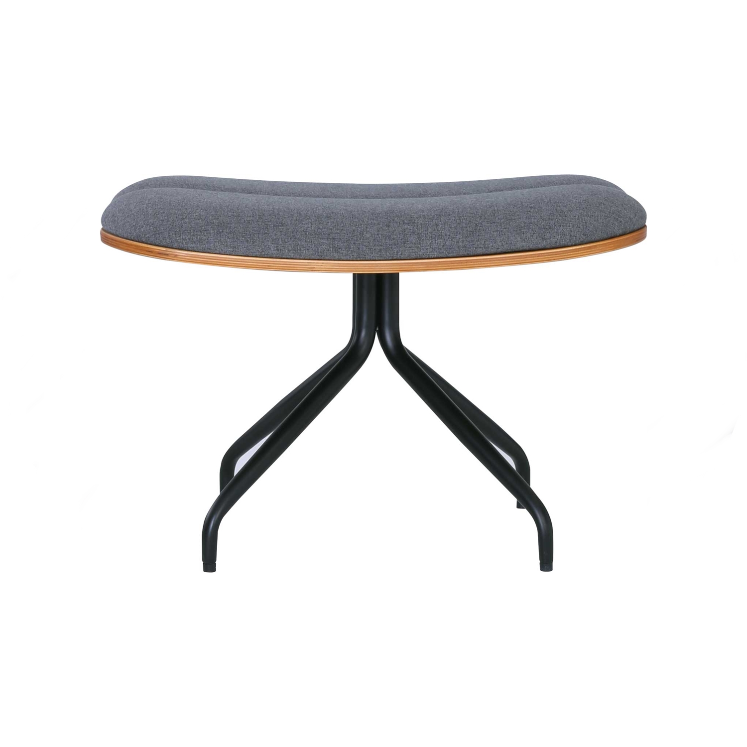 Crown ottoman with Matt Black Epoxy leg, Walnut veneer base and seat with Battleship Grey colour in Dimity fabric
