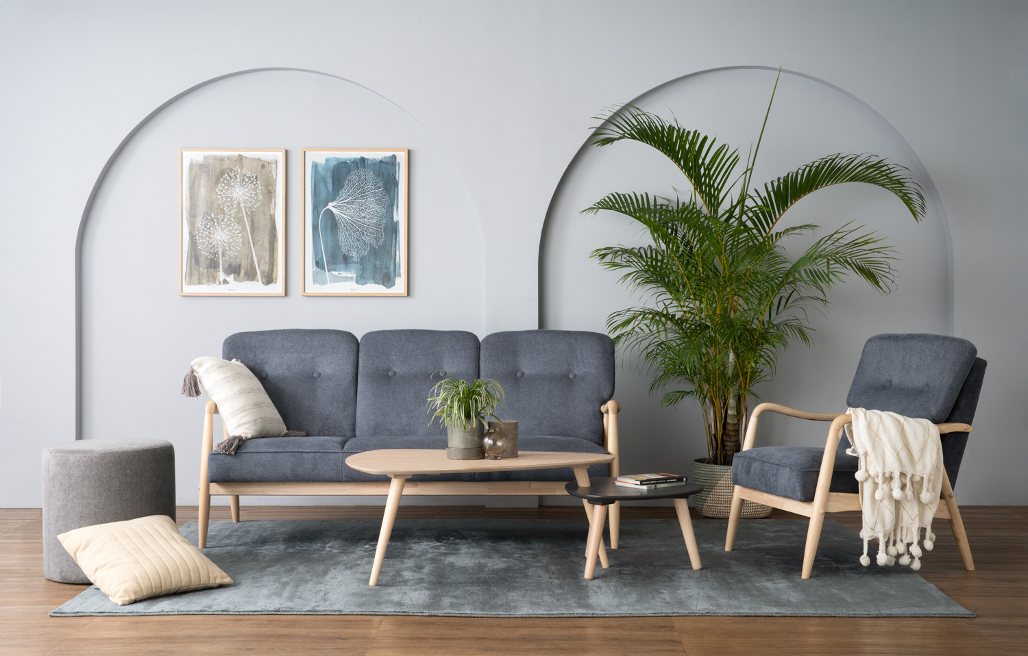 Figaro 3 seater sofa with White Wash colour frame, Dim Blue colour Moleen fabric