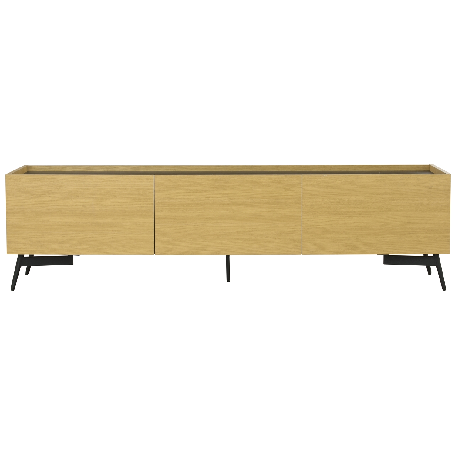 Lefty 1.78M TV cabinet in Oak laminate body and Black laminate top with Matt Black Epoxy leg
