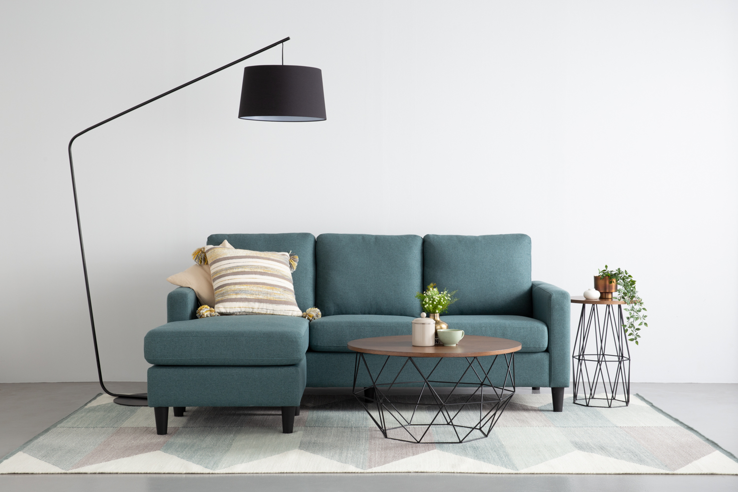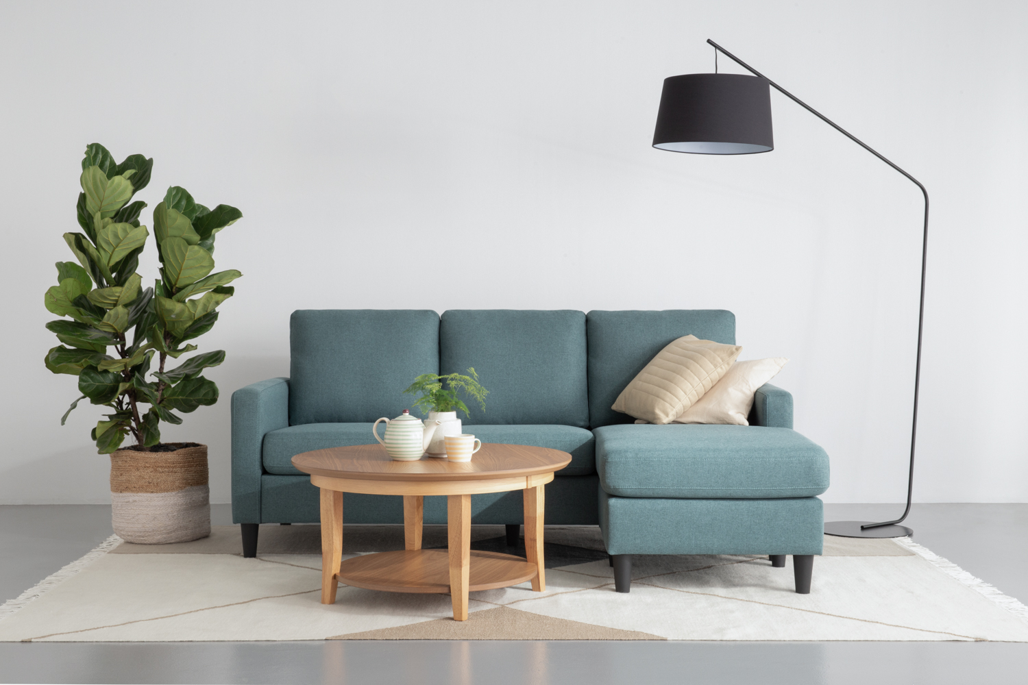Micra L-Shape sofa in Black colour leg, Nile Green Challis fabric body