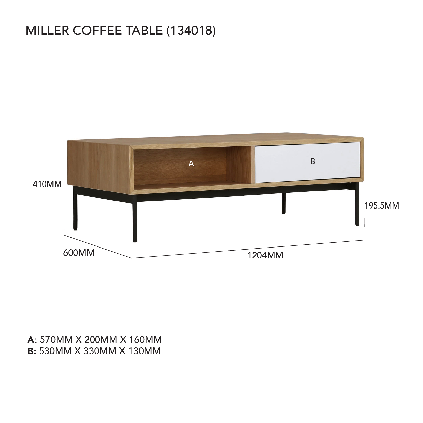 Miller coffee table in Oak veneer body and White colour drawer, Matt Black Epoxy leg