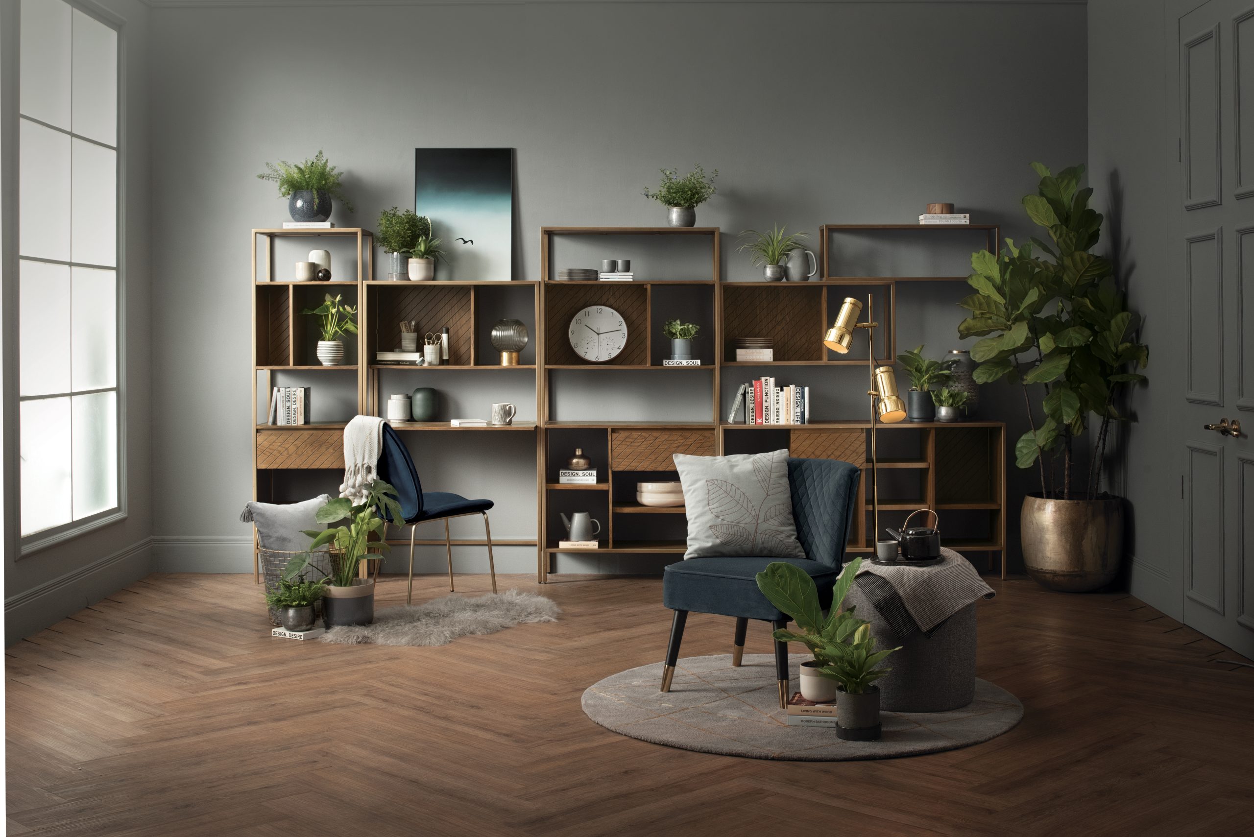 Nalanie Lounge Chair with Black and Gold colour leg, Dim Blue colour Arctus fabric