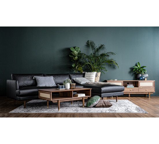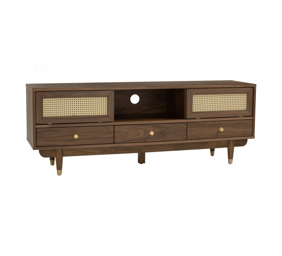 Royston 1.6M TV Cabinet in Walnut veneer body, Natural color synthetic rattan door and with Gold colour leg
