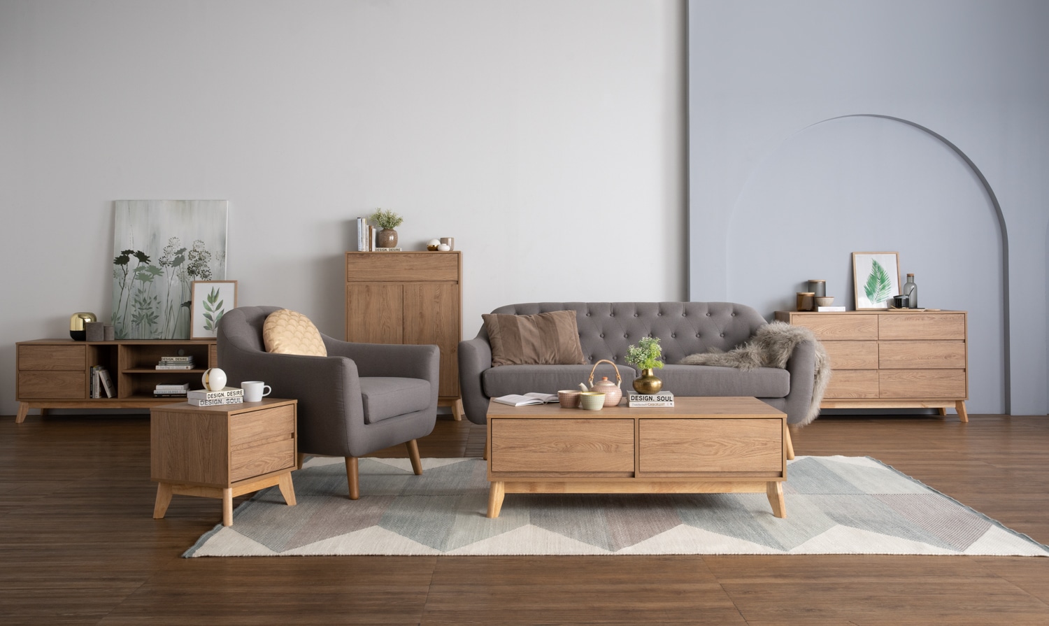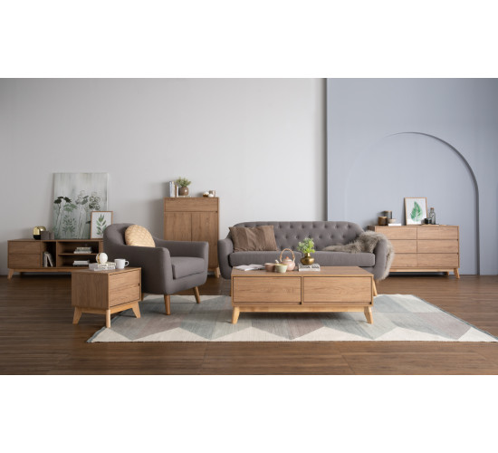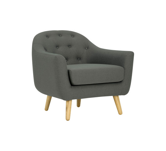 Senku single seater sofa with Oak leg, Grey colour body & button in Burrel fabric