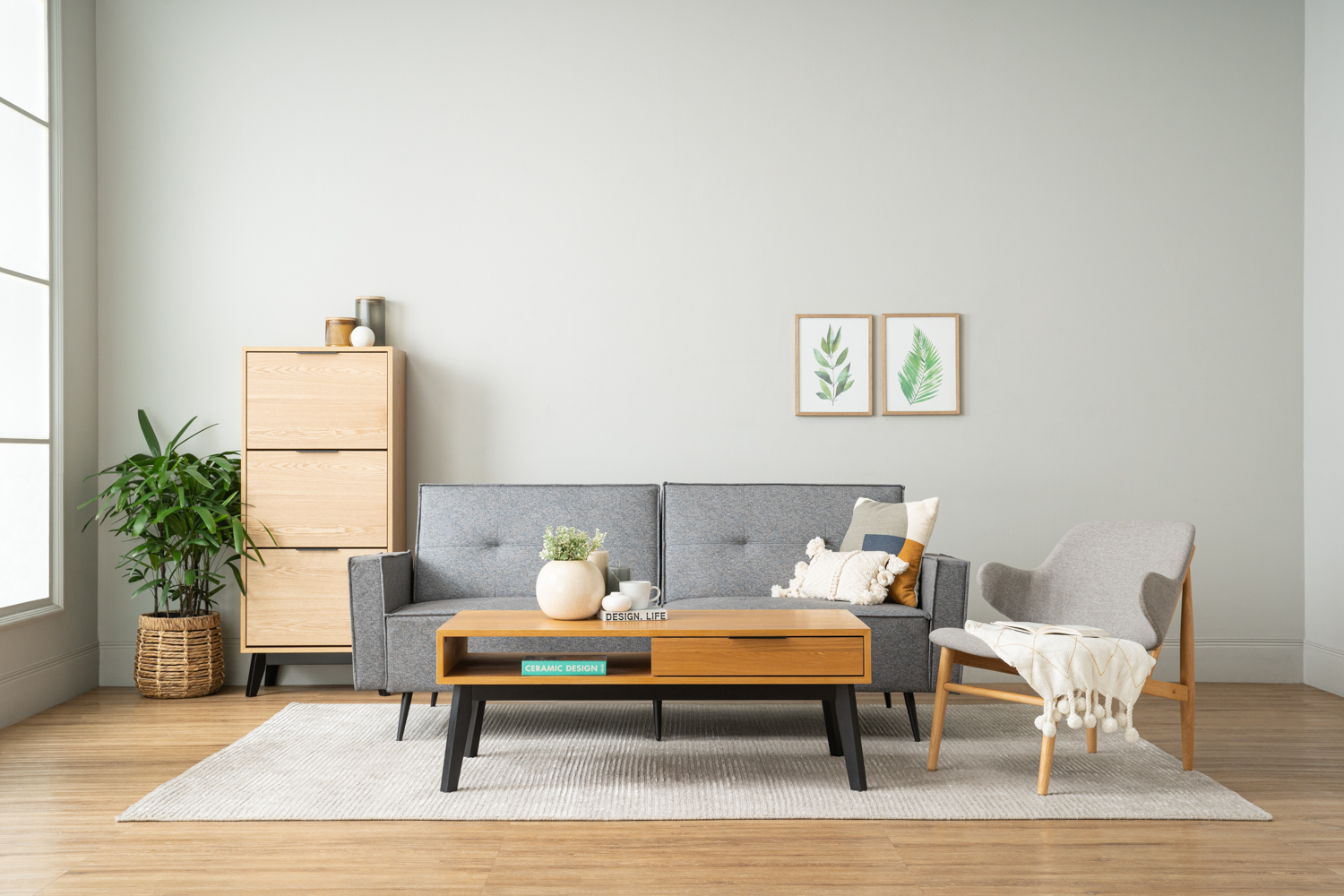 Vezel lounge chair in Natural colour frame with Dolphin colour Dimity fabric cushion