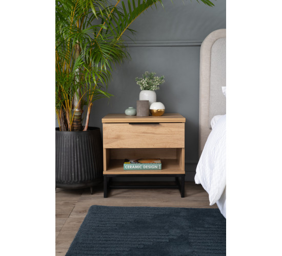 Waldo Bedside Table in Wotan Oak melamine top with Matt Black Epoxy colour leg