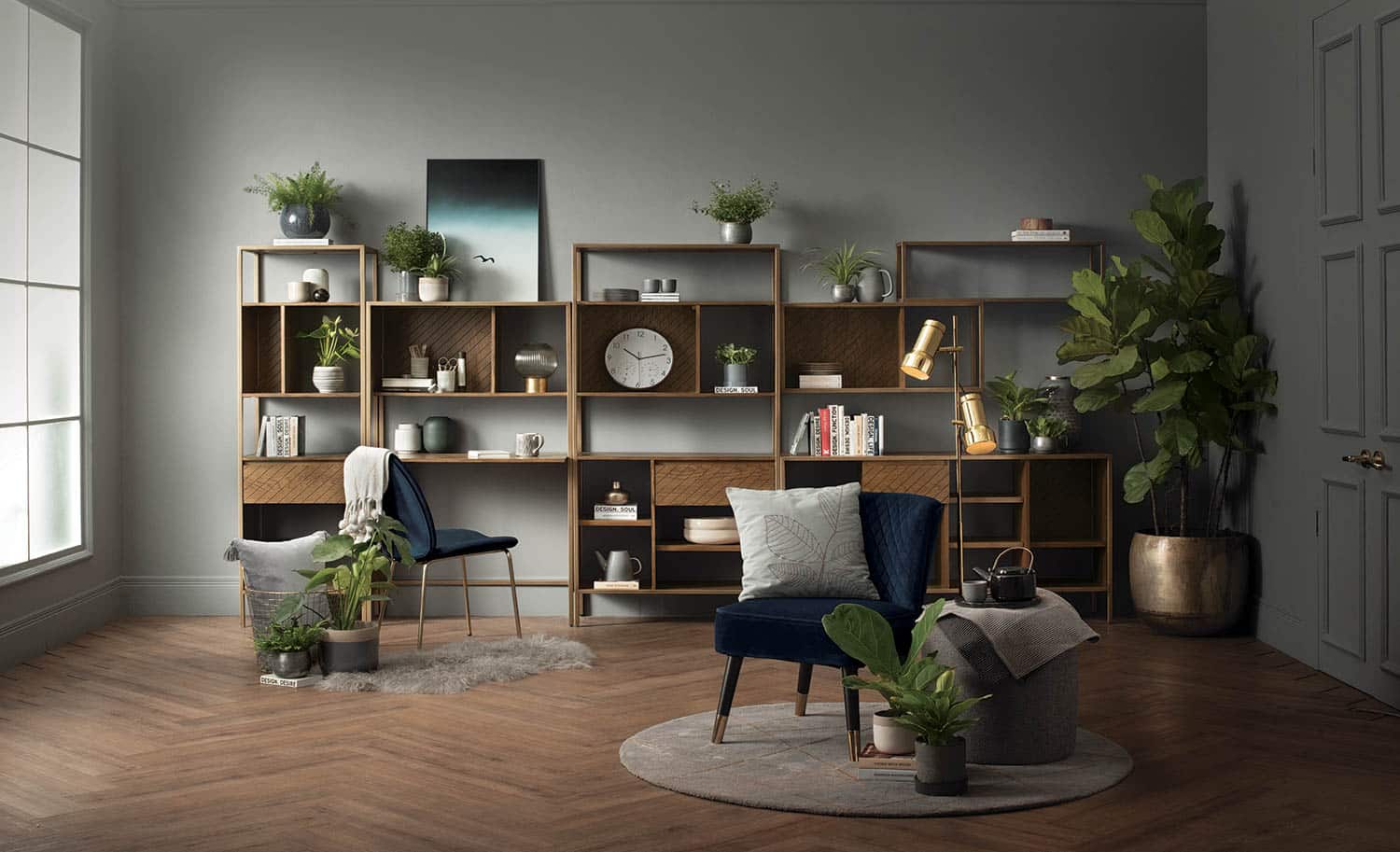 Willingham Low Bookcase with Brushed Brass colour frame, Boston Cherry colour body